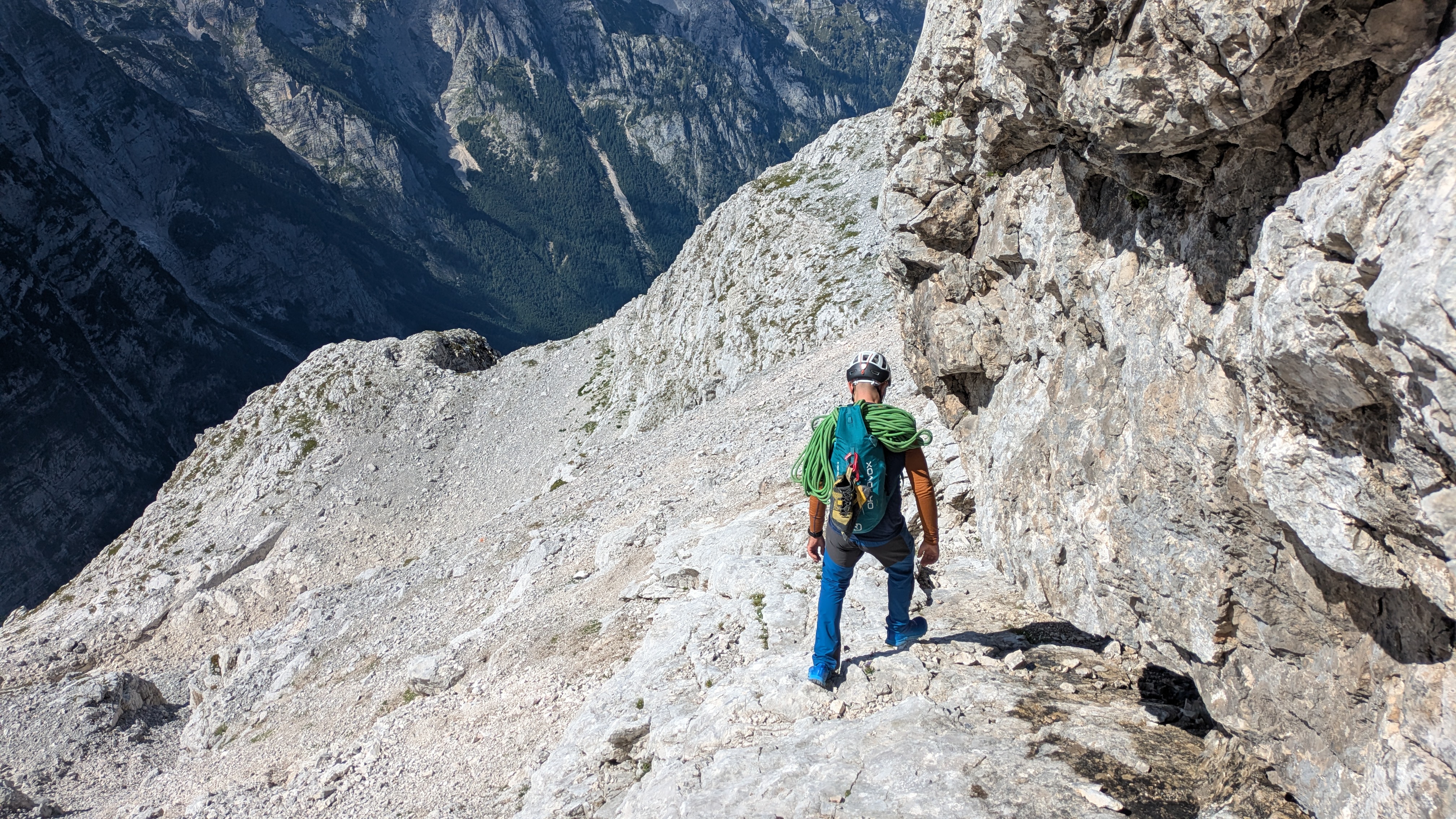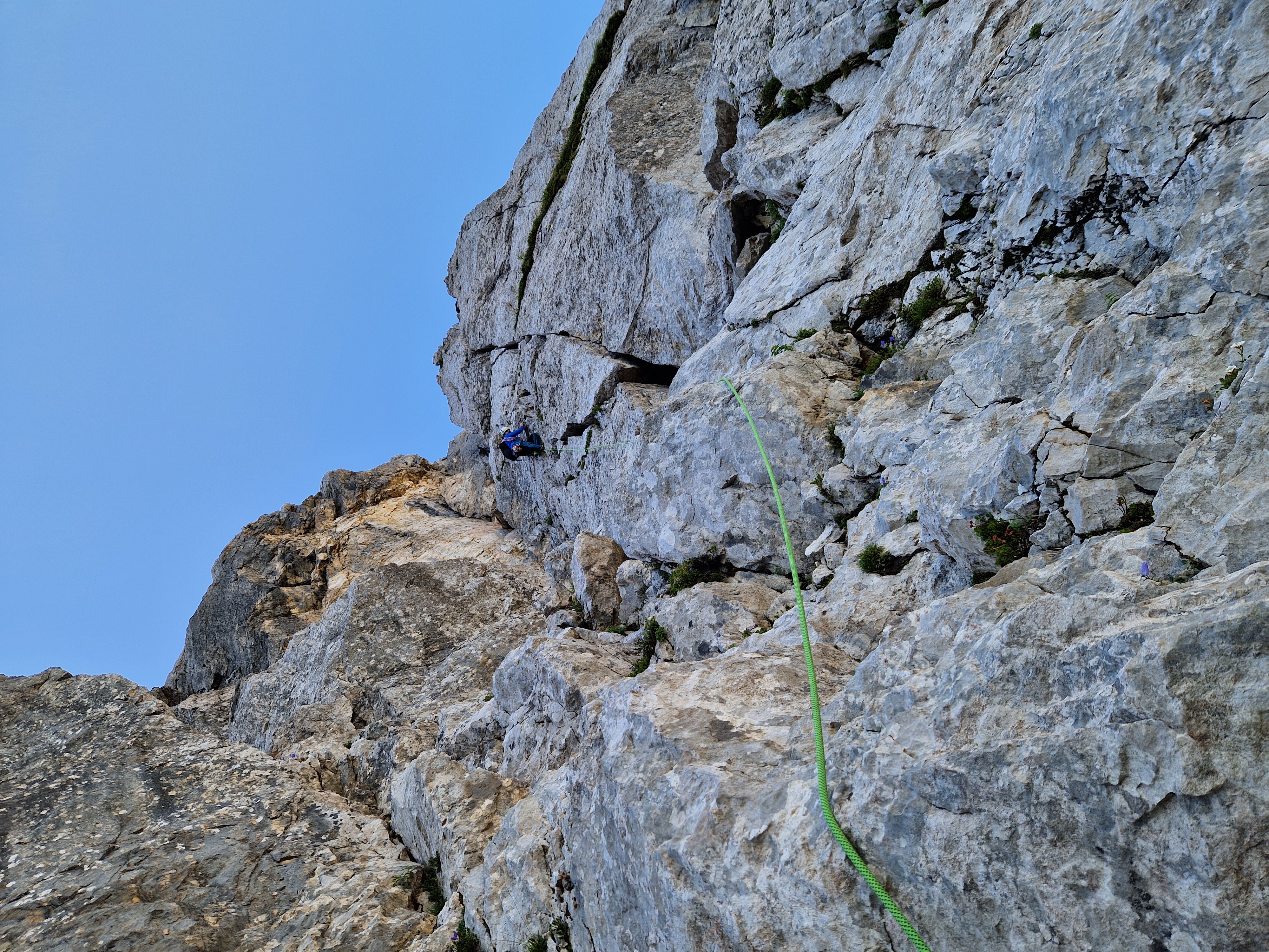 Nakon kraćeg odmora s pogledom na predivne Zlatorogove police krenuli smo dalje, najprije po lakoj grapi kroz koju smo se samo prošetali nakon čega smo se našli ispod Nemške grape koja vodi prema oknu. Naš put nakon toga vodio je više u lijevo međutim ja sam bio toliko opčinjen tim oknom te sam podsvjesno svom silo želio ići u desno prema njemu. Dijelom i zbog toga što sam u tom smjeru lakše nailazio na klinove. Zbog toga sam si napravio takvo trenje da sam jedva došao do sljedećeg sidrišta usred sipara. Tu je smjer krenuo oštro u lijevo po širokoj polici dužine 100-tinjak m za koju Gregor tvrdi da je najljepša polica po kojoj je u životu penjao.