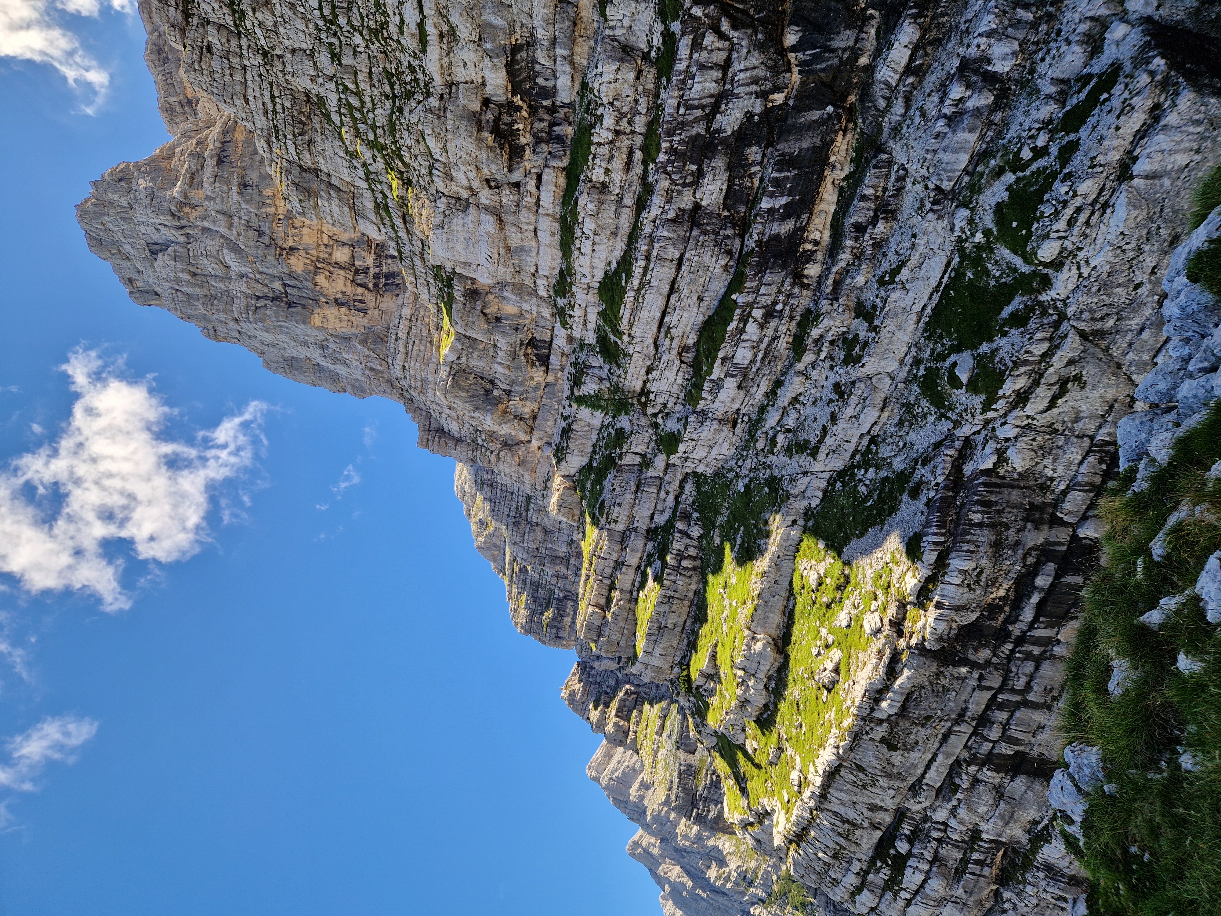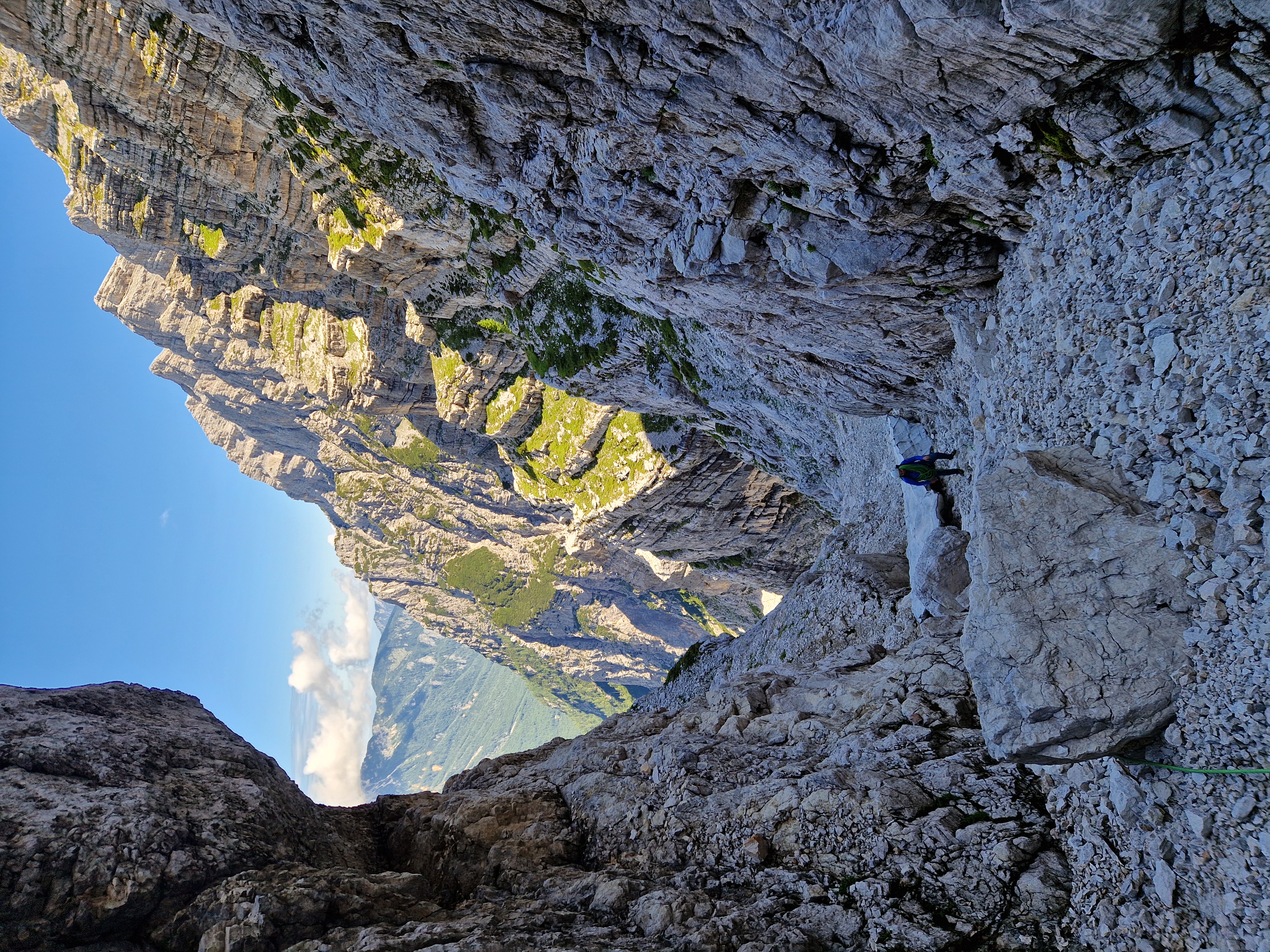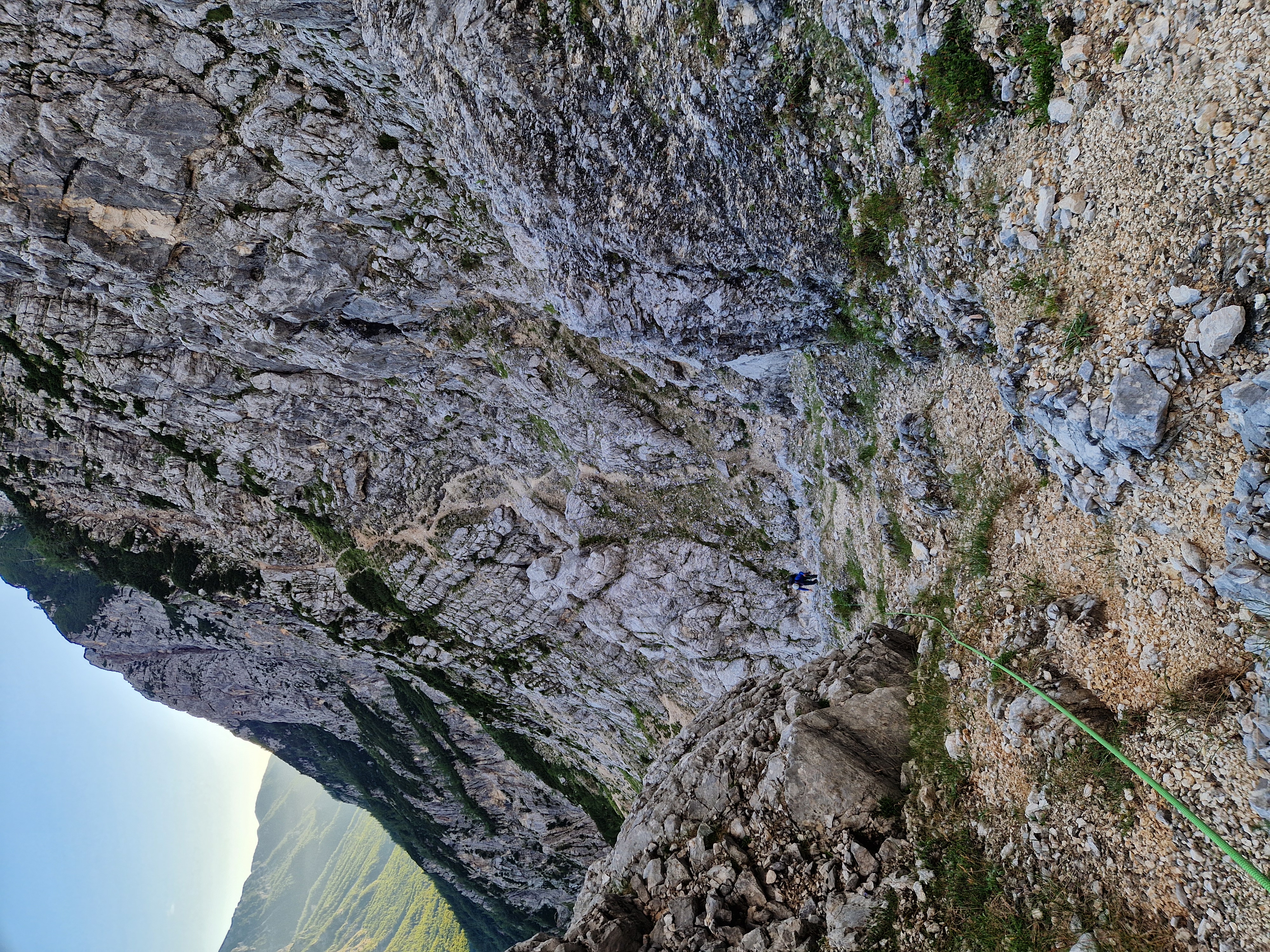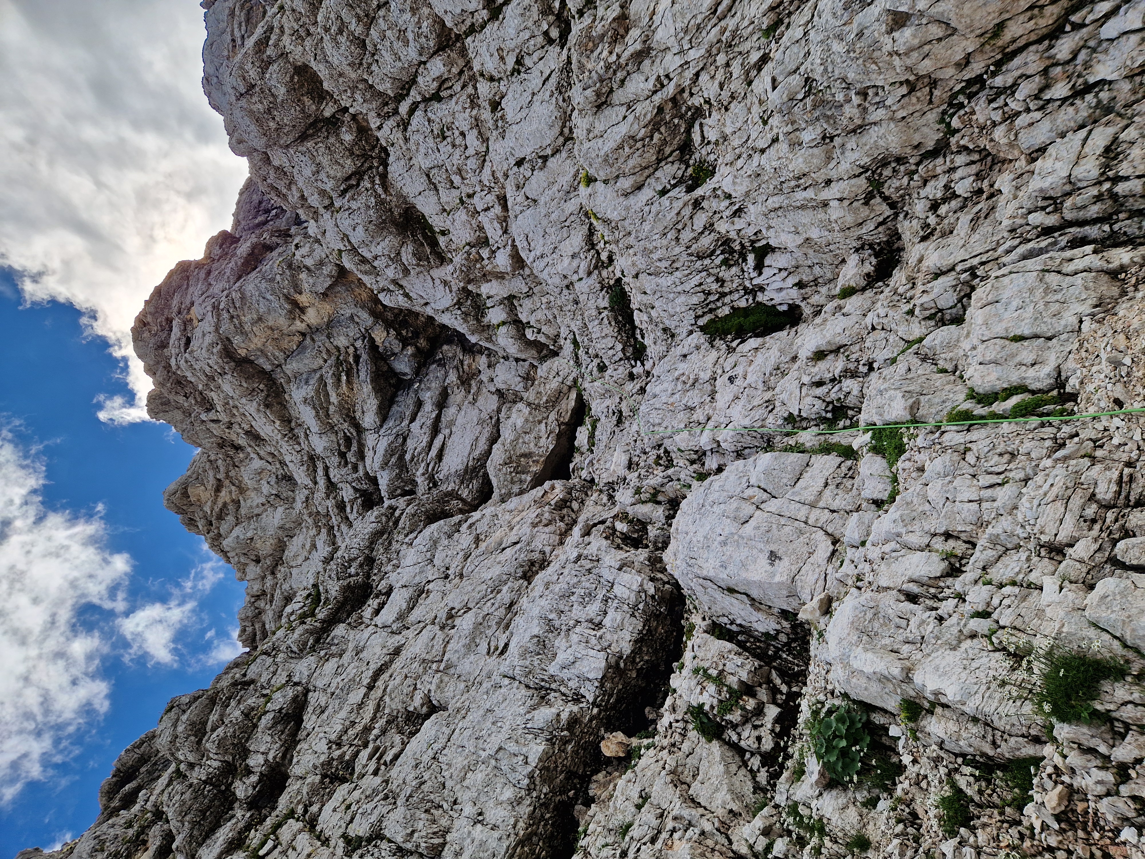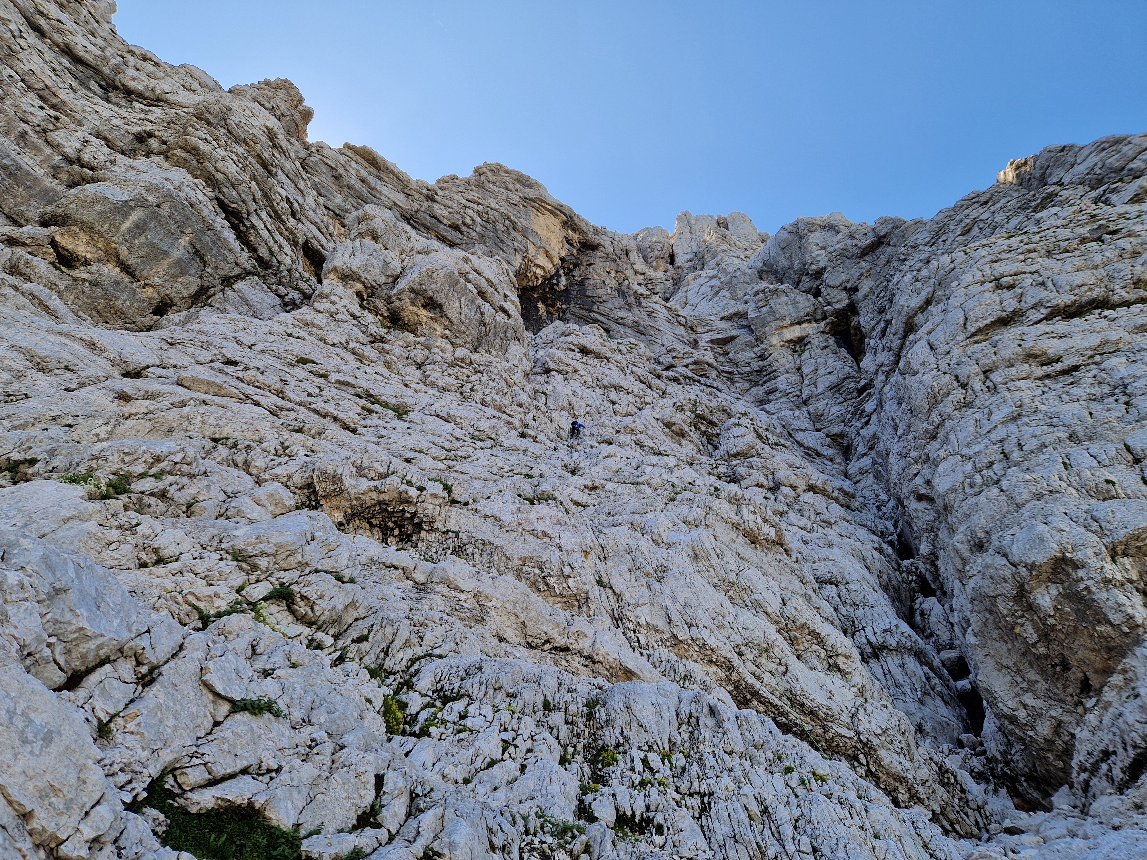 Nakon kraćeg odmora s pogledom na predivne Zlatorogove police krenuli smo dalje, najprije po lakoj grapi kroz koju smo se samo prošetali nakon čega smo se našli ispod Nemške grape koja vodi prema oknu. Naš put nakon toga vodio je više u lijevo međutim ja sam bio toliko opčinjen tim oknom te sam podsvjesno svom silo želio ići u desno prema njemu. Dijelom i zbog toga što sam u tom smjeru lakše nailazio na klinove. Zbog toga sam si napravio takvo trenje da sam jedva došao do sljedećeg sidrišta usred sipara. Tu je smjer krenuo oštro u lijevo po širokoj polici dužine 100-tinjak m za koju Gregor tvrdi da je najljepša polica po kojoj je u životu penjao.