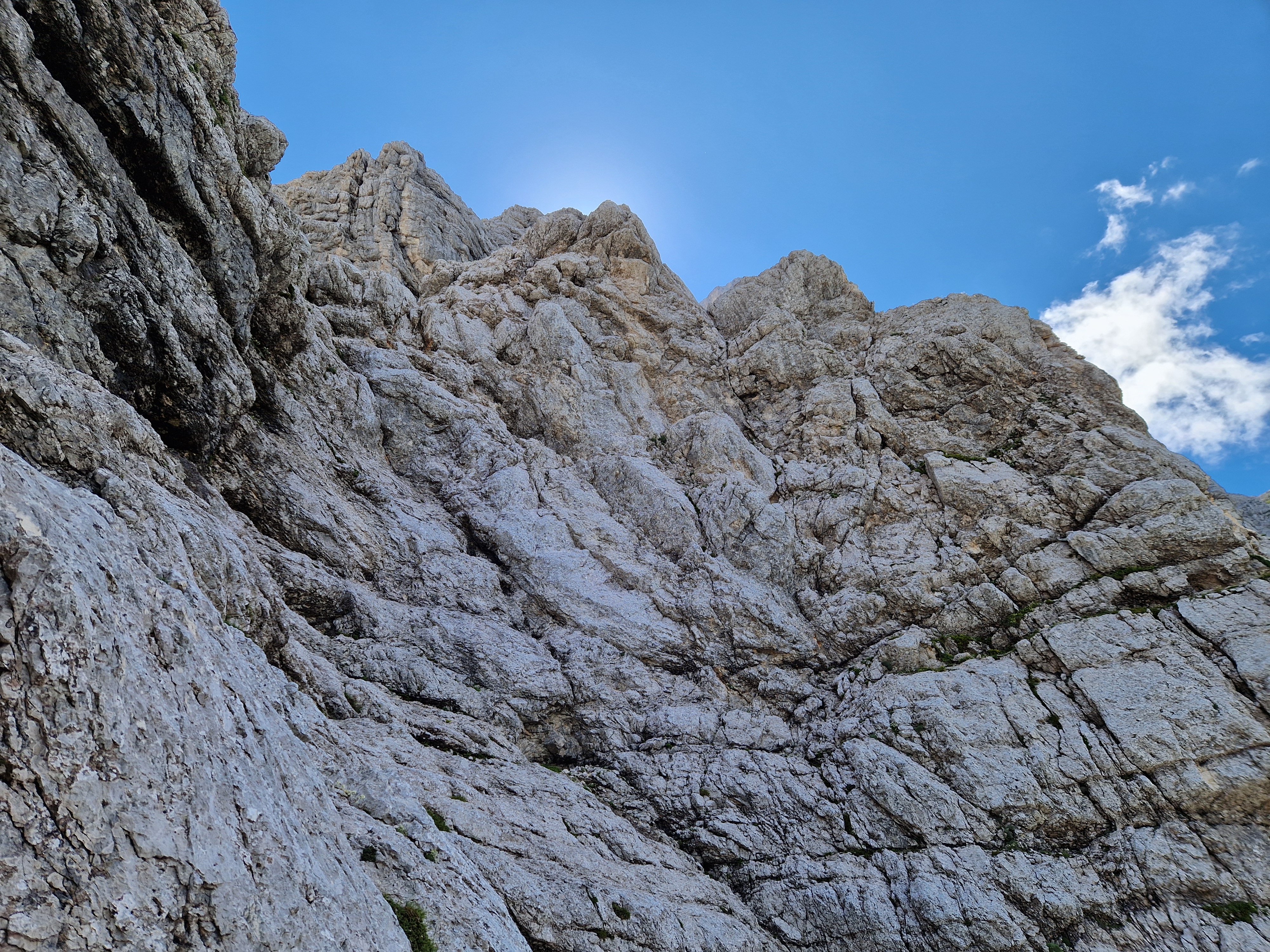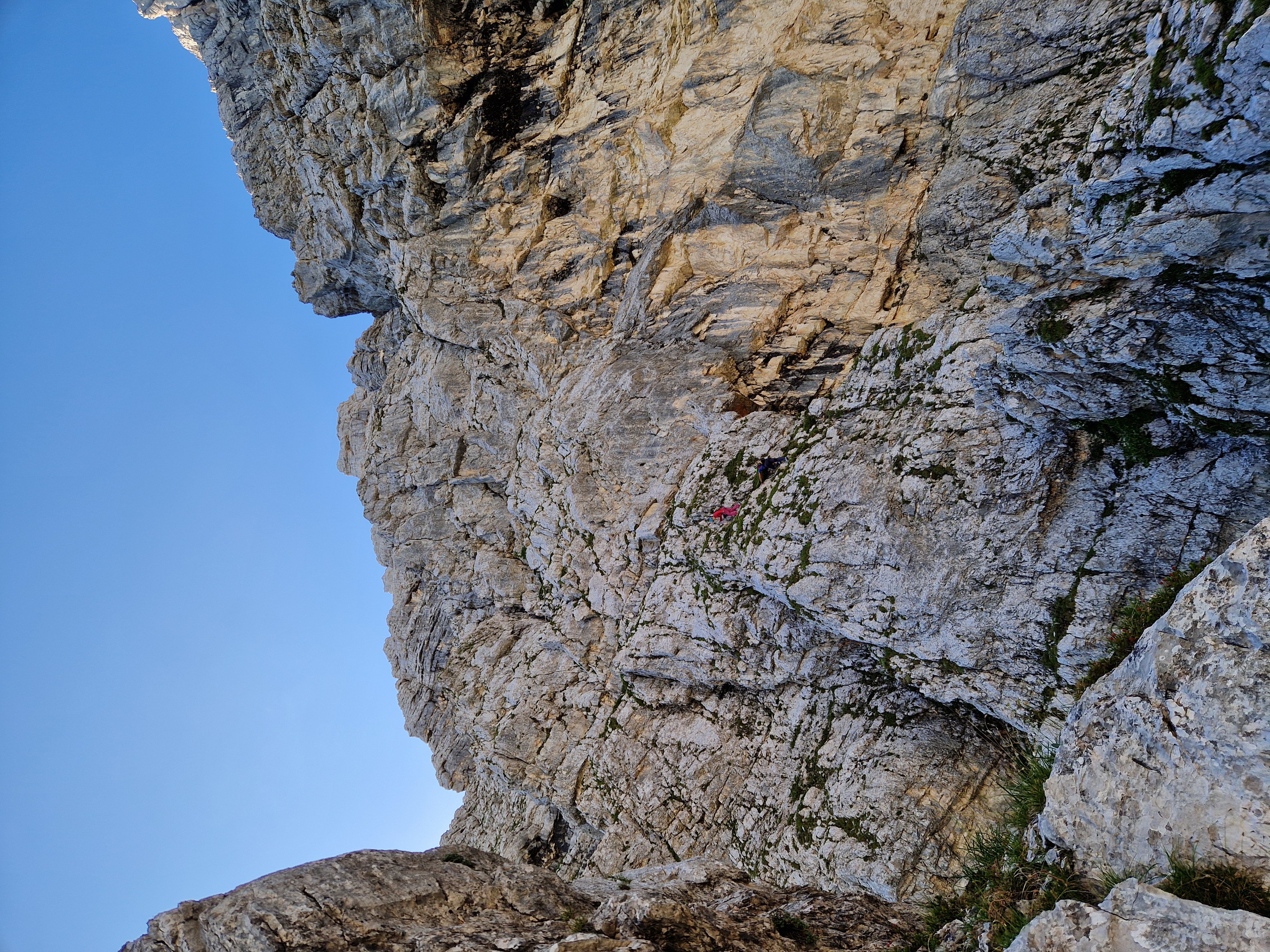 Nakon toga uslijedile su još 3-4 kraće, ali teže dužine, za koje nismo u potpunosti sigurni da smo popeli na pravi način (možda nam zbog toga i jesu bile teže). Iz smjera smo izašli oko 15:30 nakon gotovo 9h penjanja i tamo se sreli s našim cimerima Slovencima iz sobe 203 koji su upravo izašli iz Slovenske smeri koja završava na istom mjestu.